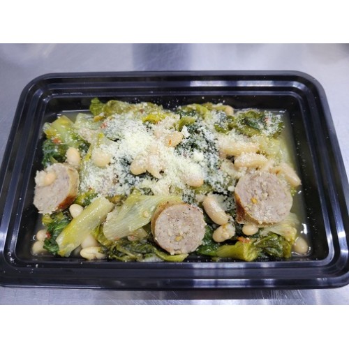We saute' tender savory escarole and tender Cannellini beans with our delicious sweet italian sausage in Extra Virgin Olive Oil, bold garlic and just a hint of crushed read pepper. Perfect Italian comfort food.