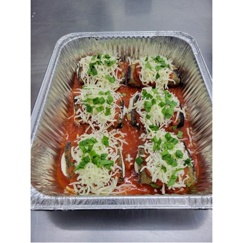 Naples cut eggplant rolled around our five cheese ricotta filling then covered with Passata sauce and shredded provolone/mozzarella cheese