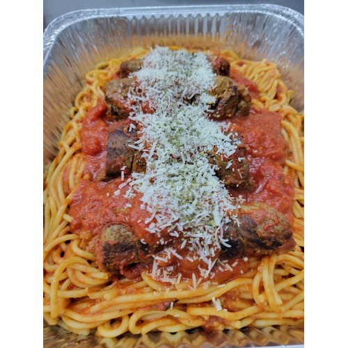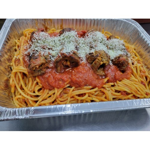 4 Sliced beef rolls filled with prosciutto, garlic, pecorino romano, breadcrumbs, pine nuts, and herbs, braised in a flavorful tomato sauce and served with spaghetti pasta