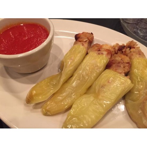 Hot Banana Peppers stuffed with our hot sausage then topped with Marinara sauce, Provolone, and Mozzarella cheeses.